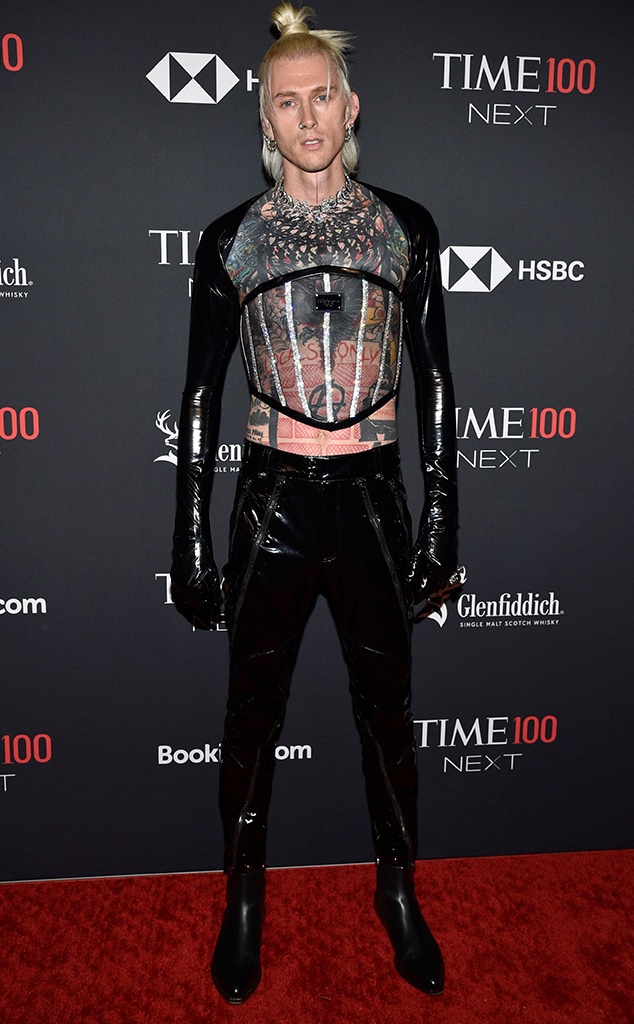 Machine Gun Kelly Wears Latex Corset Look Attends Time100 Next Gala With A Fiery Megan Fox Entertainment Tonight